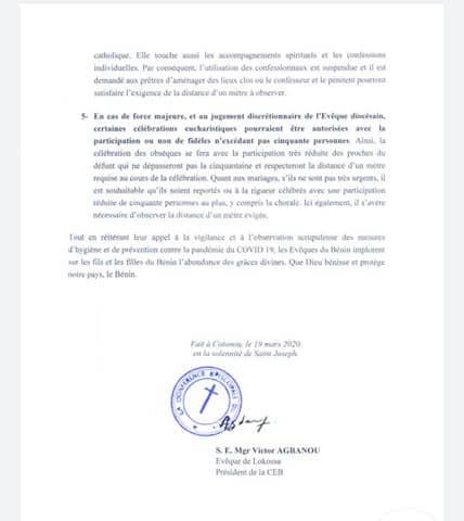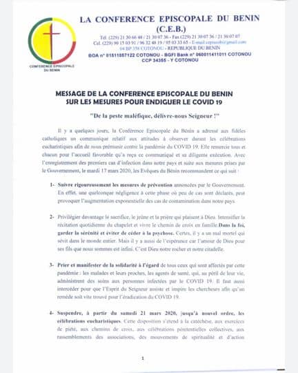 Vu l’évolution de la pandémie de Coronavirus, la Conférence Episcopale du Bénin vient de prendre de nouvelles mesures pour la prévention de ce mal. Parmi ces mesures prises ce jeudi 19 Mars 2020, figure la suspension jusqu’à nouvel ordre des célébrations eucharistiques et autres.